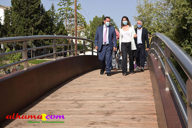 El presidente de la Diputación de Granada, José Entrena, el diputado de Obras Públicas y Vivienda, José María Villegas, junto a la alcaldesa de Santa Cruz del Comercio, Ángeles Jiménez, han visitado hoy las obras finalizadas de la pasarela peatonal construida sobre el río Alhama, un paso importante para los vecinos del municipio, que durante décadas han reclamado su arreglo ya que sufrían las consecuencias de las crecidas y avenidas del río que arrastraban, incluso, las pasarelas manuales que los vecinos colocaban cada vez que se interrumpía el paso.