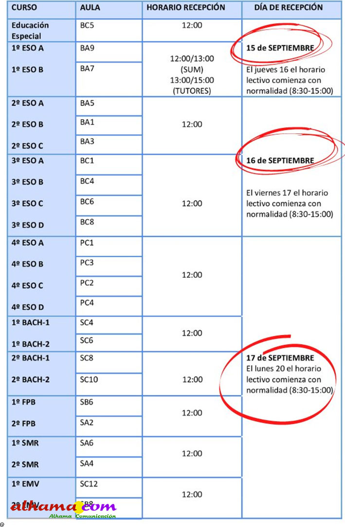 - 15 septiembre 12:00/15:00 h., recepción de: 1º ESO y EE (el 16 comienza clases con normalidad en horario de 8:30 a 15:00)